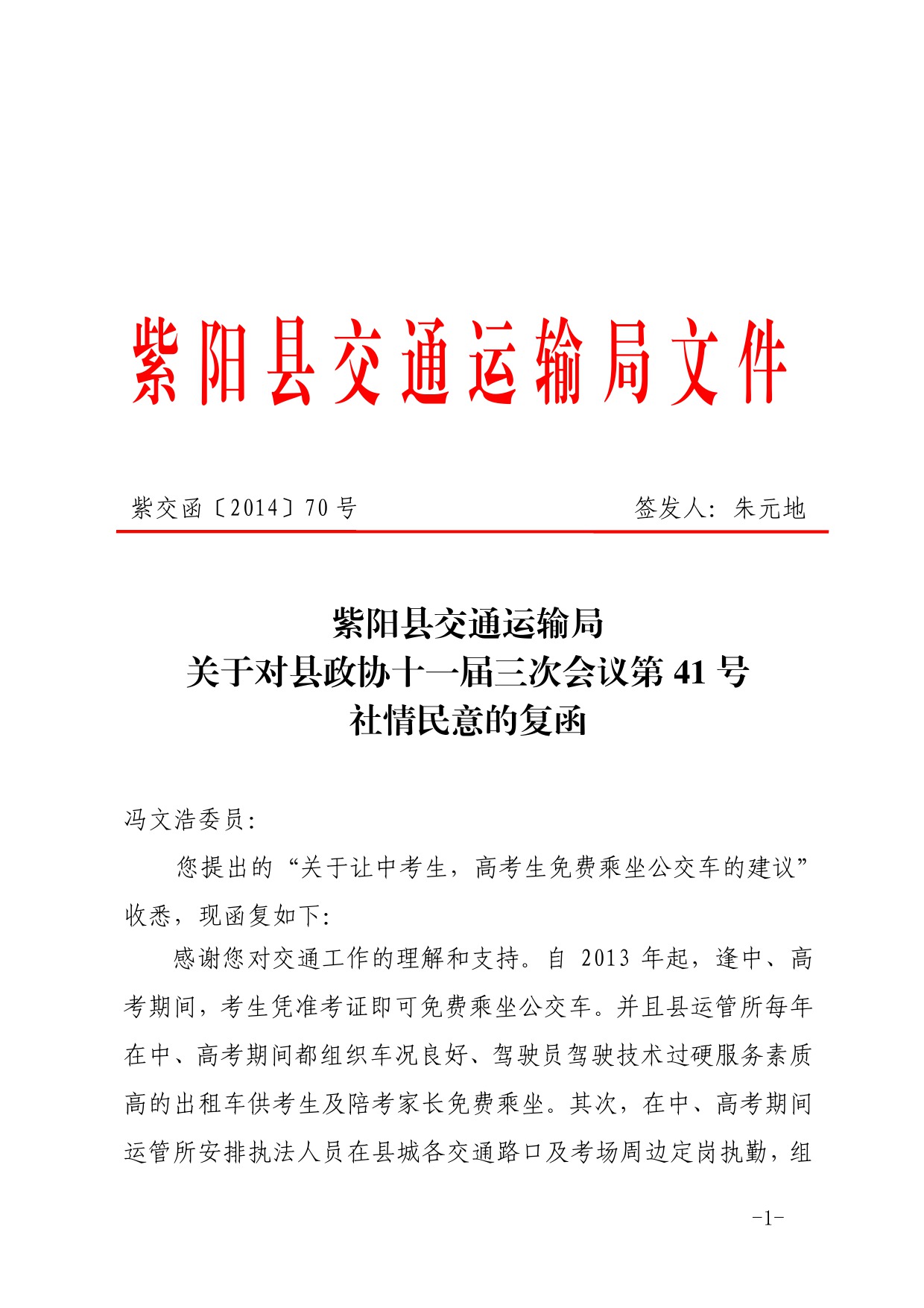 政协十一届三次会议第41号社情民意复函