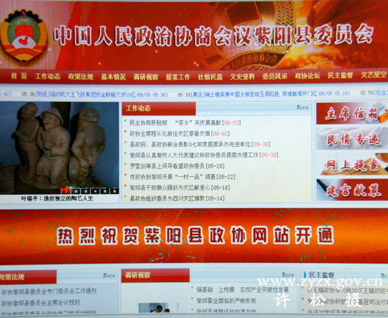 6月5日,紫阳县政协网站正式开通,政协主席程从礼在网站开通仪式上致辞,开通仪式还邀请了县委副书记李大明、县人大常委会副主任黄振宙、政府副县长刘济兵等县上领导和政协常委。在开通仪式上县上领导和各位常委们分别点击了政协网。 紫阳县政协网站集宣传政协政策法规、传递中、省、市、县相关信息、开展委员网上论坛、网上提案等功能于一体。它既是我县宣传的一个重要阵地,也是我县政协组织与党委政府部门、社会各界沟通的桥梁;它既是展示我县政协事业发展成就的窗口,也是关心和支持我县发展的各界有识之士献言献策、相互交流的平台。网站的开通运行将在建设富裕、文明、和谐新紫阳的进程中发挥重要的作用。
