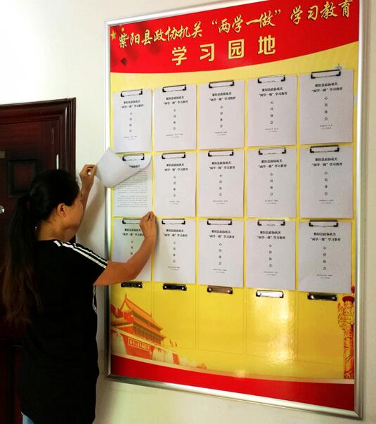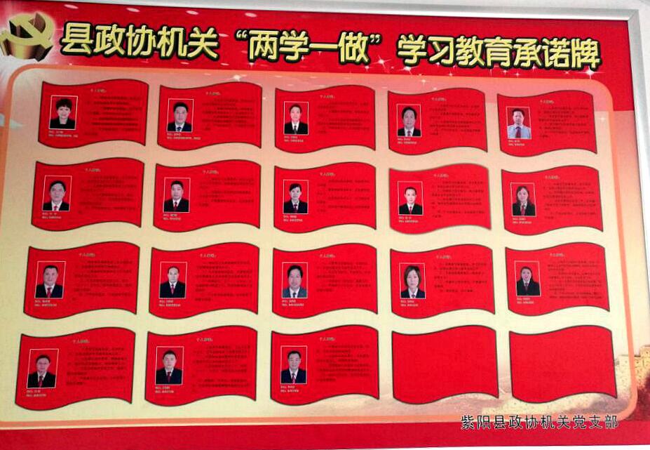 晾晒学习教育承诺。统一制作了政协机关党员干部“两学一做”学习教育承诺牌,将每一名党员、干部的姓名、岗位和“两学一做”学习教育承诺集中“晾晒”,使党员干部时刻处于广大群众的监督之下,促进工作作风不断优化,推动“两学一做”学习教育深入开展。