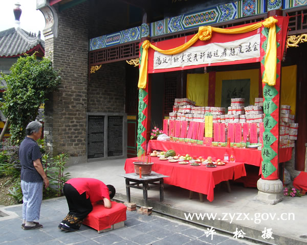 每年的农历七月十五日为中元节,也称“盂兰盆节”(中元节归属道教、盂兰盆节归属佛教),在紫阳也俗称“鬼节”,又称亡人节、七月半。今年中元节,紫阳县紫云宫邀请西安八仙宫经乐团经师举行中元超度亡灵大法会,诵经、“烧包”、“放焰口”祭奠超度四川汶川大地震遇难同胞及过往亡人。 紫云宫住持、市县政协委员冯兴钊师父告诉记者,中元节是中国的传统民俗,四川大地震数万人遇难,紫云宫秉持慈悲为怀,在庙内除设斋供祭祀外,还增加了拜忏、放焰口等活动,以使逝者安息。