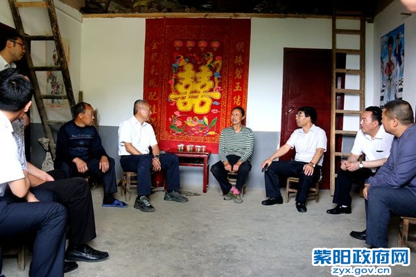 陈勇先后走访了高明忠、李兴科等贫困户,每到一户都与群众促膝交流,询问政策知晓和生产生活情况,了解产业发展意愿和急需解决的问题。二组贫困户高明忠家刚刚实施危房改造,改造后的白墙石瓦土坯房与房前屋后的绿地青山协调自然,里里外外也收拾得洁净整齐,陈勇从周边环境到屋内的卧室、厨房都看得很仔细,也感到很欣慰。在与高明忠的母亲毛从青交谈中,陈勇详细询问了她家的人口结构、收入来源、当前困难和未来打算,当得知她丈夫早逝,小儿子因伤致残,劳动力低下,本人更是常年多病,每年至少花去过万的医疗费用后,陈勇说,因病致贫是农村普遍存在的一种现实问题,农村医疗条件匮乏,很多群众只能大病拖、小病扛,他嘱咐随行的镇村干部要尽快建好村卫生室,确保困难群众能够就近就医。同时要联系县镇卫生部门,针对因病致贫户,制定医疗帮扶计划,不断改善患病困难群众的身体状况,以良好的身体条件创业增收,改变贫困现状。