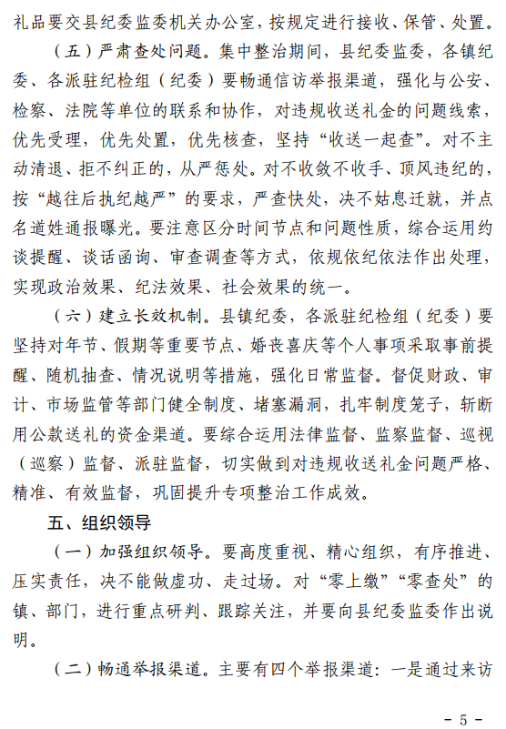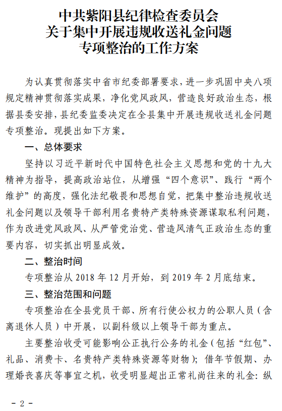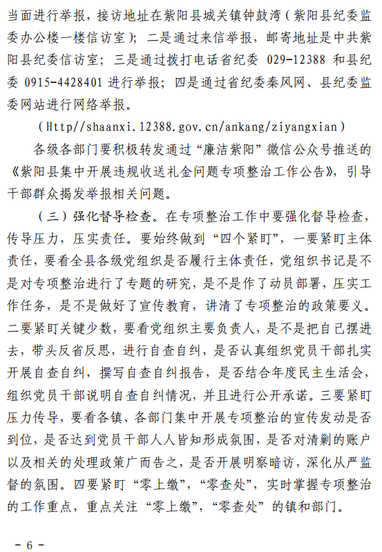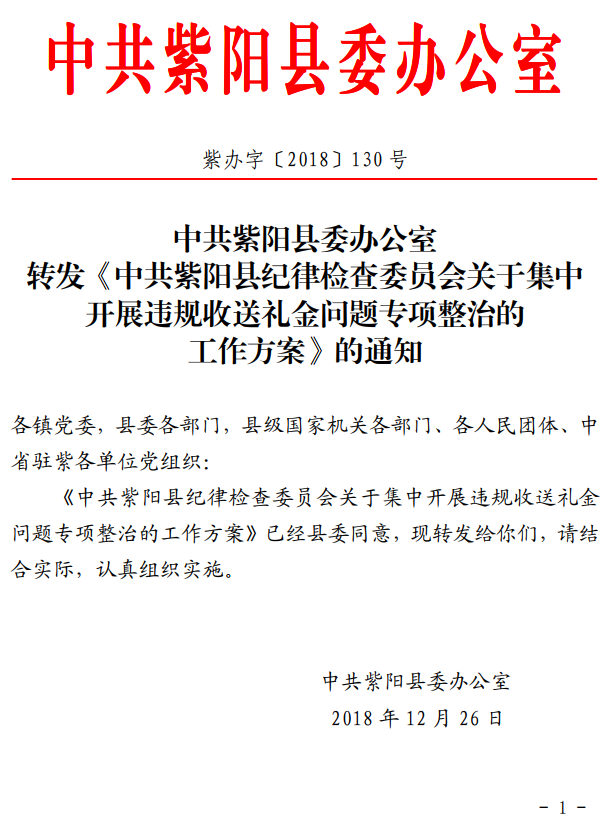 中共紫阳县委办公室转发《中共紫阳县纪律检查委员会关于集中开展违规收送礼金问题专项整治的工作方案》的通知