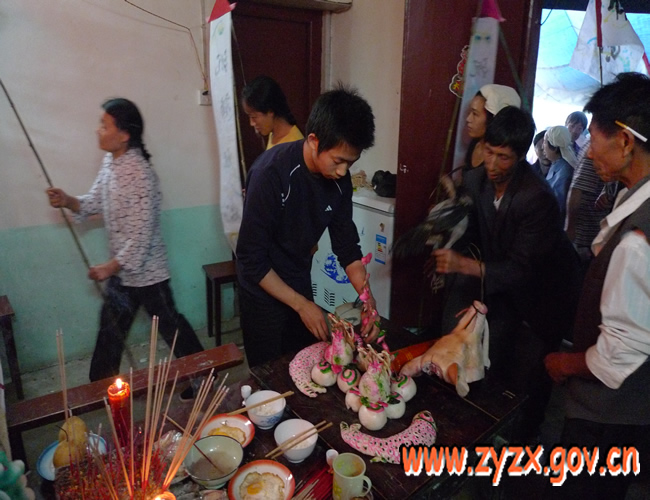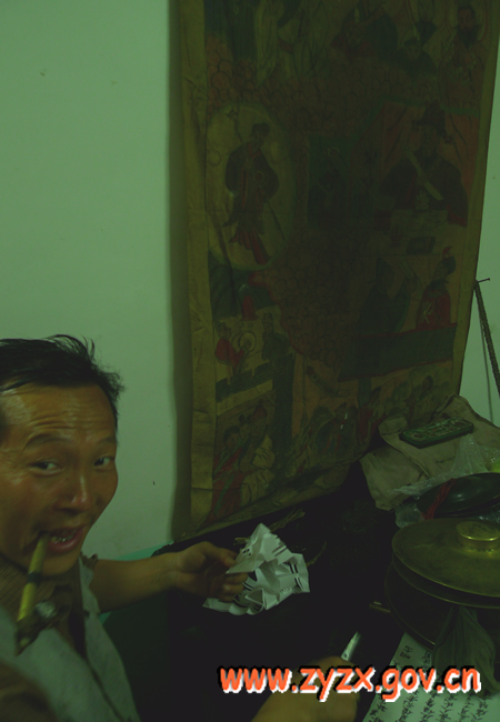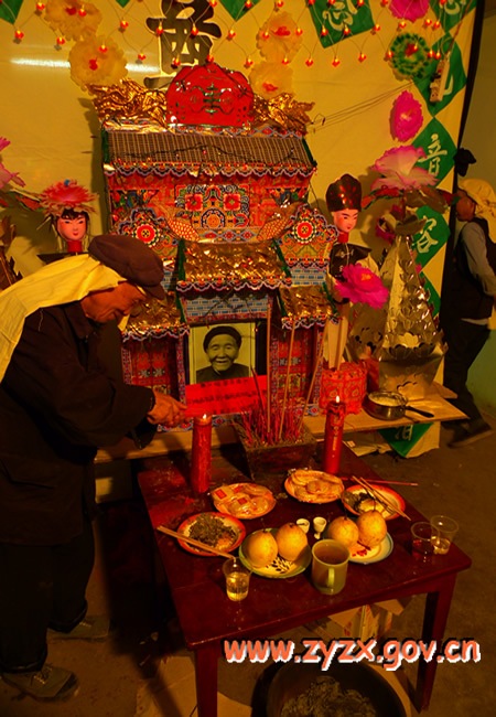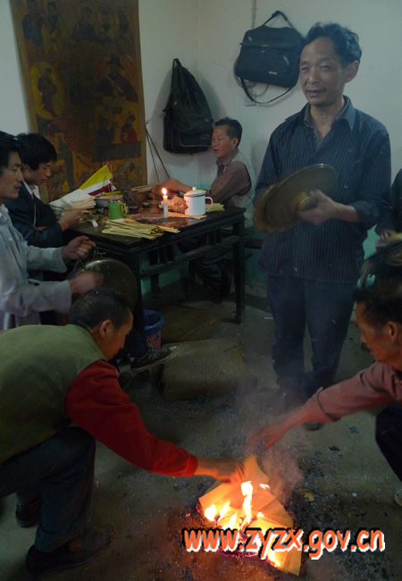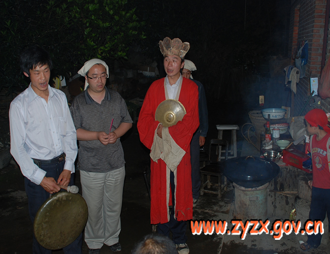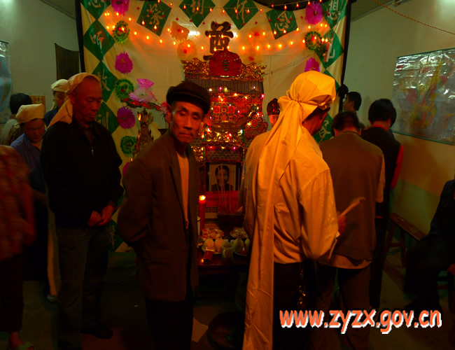 今年6月10日(农历5月18)家住任何岸边广城乡92岁的贺俊园老人去世。在紫阳,老人故去年满花甲便称为喜丧,称为“白喜事”,这是要大办的,当地叫做“当大事”。 听说贺老太婆的后人要为老人做道场,我们便驱车赶往离县城38公里的广城乡。广城乡位于紫阳的西南端,因地处巴山深处,其习俗遗有巴蜀风情。任河流域的丧葬习俗在紫阳极有鲜明的个性且有代表性。 紫阳民间的治丧道场有深远的历史,老人去世,都得请道士(与出家的道士有别,应是民间从事丧葬文化的艺人)做道场。在古老的中国神话《山海经》中就有几个大巫环绕一个死尸,手持青蛇驱除死神的场景。道场做两天三夜或三天四夜,甚至有九天十夜。只做一晚上叫“打绕棺”,男叫地狱绕棺,女叫血河绕棺。道场也绕棺,但道场只做前半夜,后半夜“肃坛”(临时轮流休息)。每天拂晓,专有一人用大锣轻敲六下,催请所有肃坛的人“上岗”。做道场第一天要封斋,不能食荤菜,并有“鉴诫”仪式,随之张贴“关文”,进行“招亡”(魂)。次日投了“诸天表”,才能开荤席。道场设有三案:灵堂案、正堂案、经堂案。灵堂上香的案子上方悬有“七门吊挂”或大“奠”字及挽联。做道场一般是三至四名道师,领头人称掌坛师,有一定的文化程度,表现形式以唱、念为主,所演唱的坛歌、孝歌、烧拜香、端公调等,均是紫阳民歌的一种类型。而念经也不可乱念,敷衍了事,遇有孝家懂“经”的人听出不对头或偷懒念掉了经文的便在绕棺转丧时走到掌坛师后面用香头在经文上烧灼一下,这对做道场的道师是很没有面子的。“正夜”“绕棺”时有一定舞蹈。做道场有既定的程序内容,懂行的要求按部就班,做九坛法事。开坛请水:到井边或河边焚烧文书和唱诵文书,文书上的主要内容为死人在世的情况;二坛劄灶;到厨房焚烧文书或唱文书;三坛迎亡:主要是迎接死去的亡灵归家,唱诵的主要曲目为《迎亡科》;四坛开路:为死去的亡灵指引往阴间地府的路,并将亡魂交予阴曹地府;五坛请佛:唱诵的主要曲目为《前请佛科》,主要是向上界的始祖师爷打招呼,允许为死去的做道场,并请上天饶恕此人在生的过错;六坛绕棺:绕棺分为探五更和探亡魂。主要是围绕死者的棺木唱诵死去的人从出生到死亡的过程,曲目为《绕棺科》;七坛游地狱:就是给地府打招呼,接收死去人的亡魂,让死人的亡魂能魂归地府,围绕死者的棺木进行唱诵,主要曲目有《佛说正教血盆经》,《地藏发忏》等;八坛报恩:主要唱诵死者生前的种种功德和善事,要后辈记住死者的恩德敬好孝道,唱诵的主要内容有《十月怀胎》等;九坛解结:内容为“游十殿”主要是向十殿阎罗王承认生前犯下了的种种罪愆,(此为一殿一经,一忏一解结)唱诵的曲目为《盖灯解结科》。除以上内容外,还有建灵、过案、送神等,其间还有投“十王表”,接“地狱藏表”(跑朝---行坛接界---游狱堂五门(男亡)---日连科(女亡)---破狱(劫狱)----倒灯---小迎王---收经---荐钱等等。若亡人是“凶上去的”(意外死亡),还得“炼度”(俗称过水坑)。 丧葬道场是一种极富地域文化色彩的祭奠吊唁活动形式,其中极大地体现了汉人重葬不重养,重死轻生的人生态度。置身其间真个是“亡人闻经直入真常界,听忏高超不夜天”。